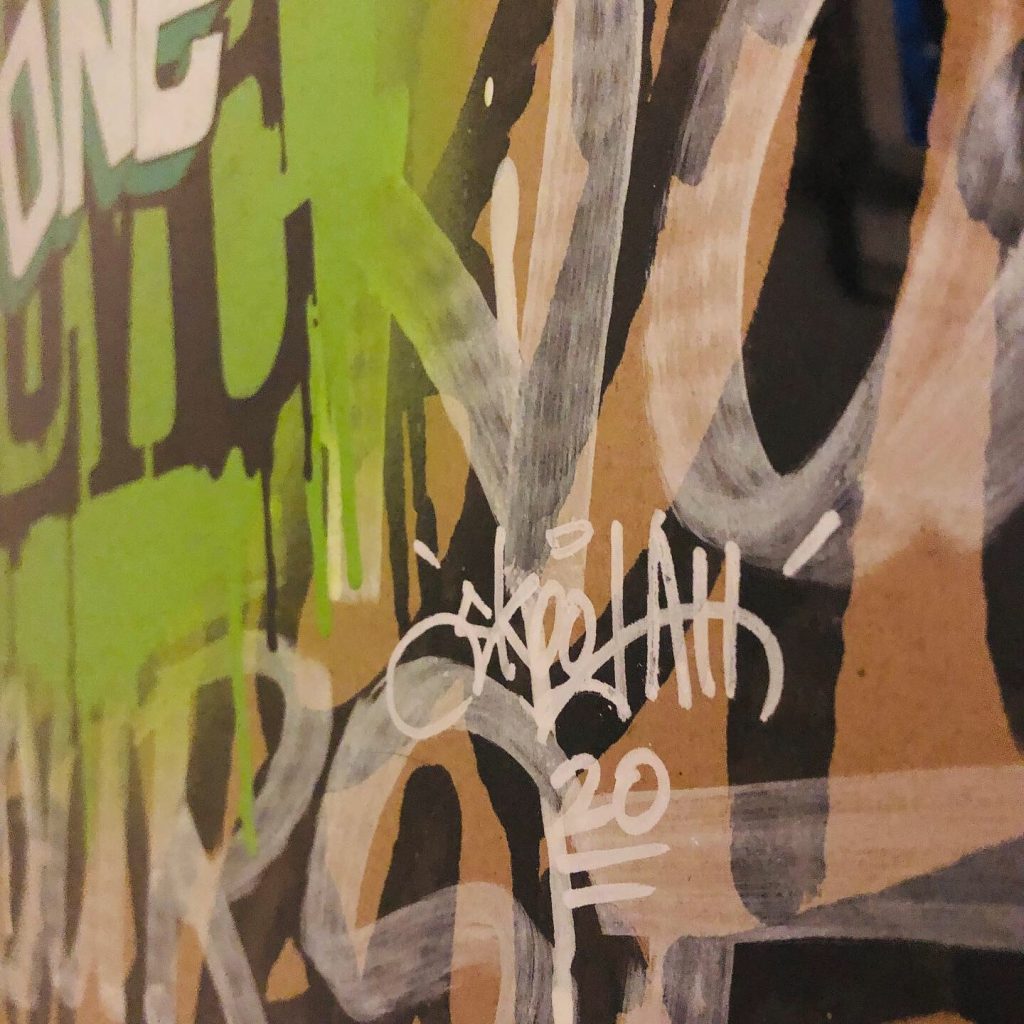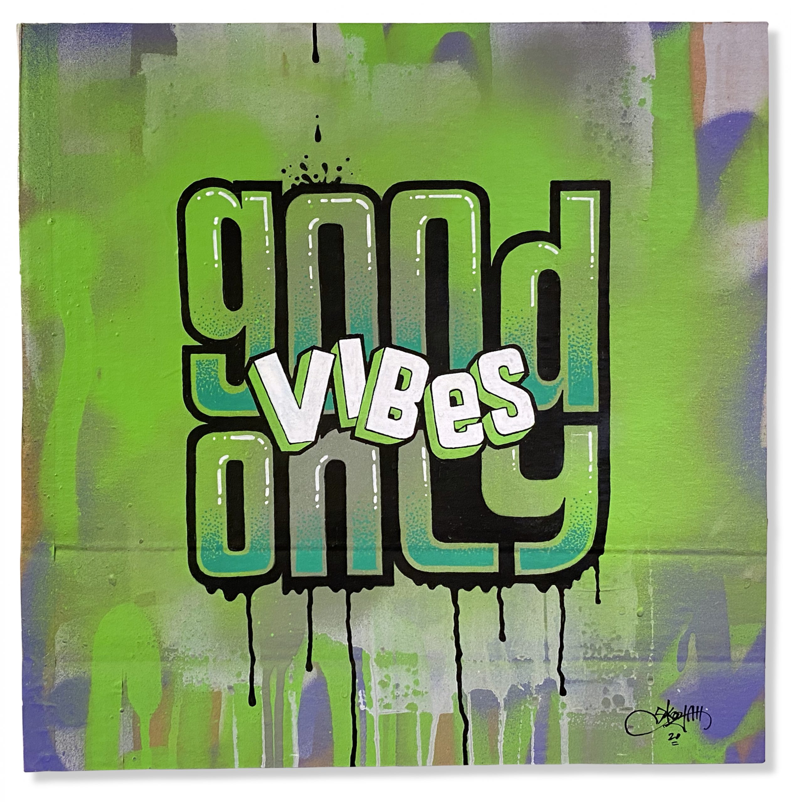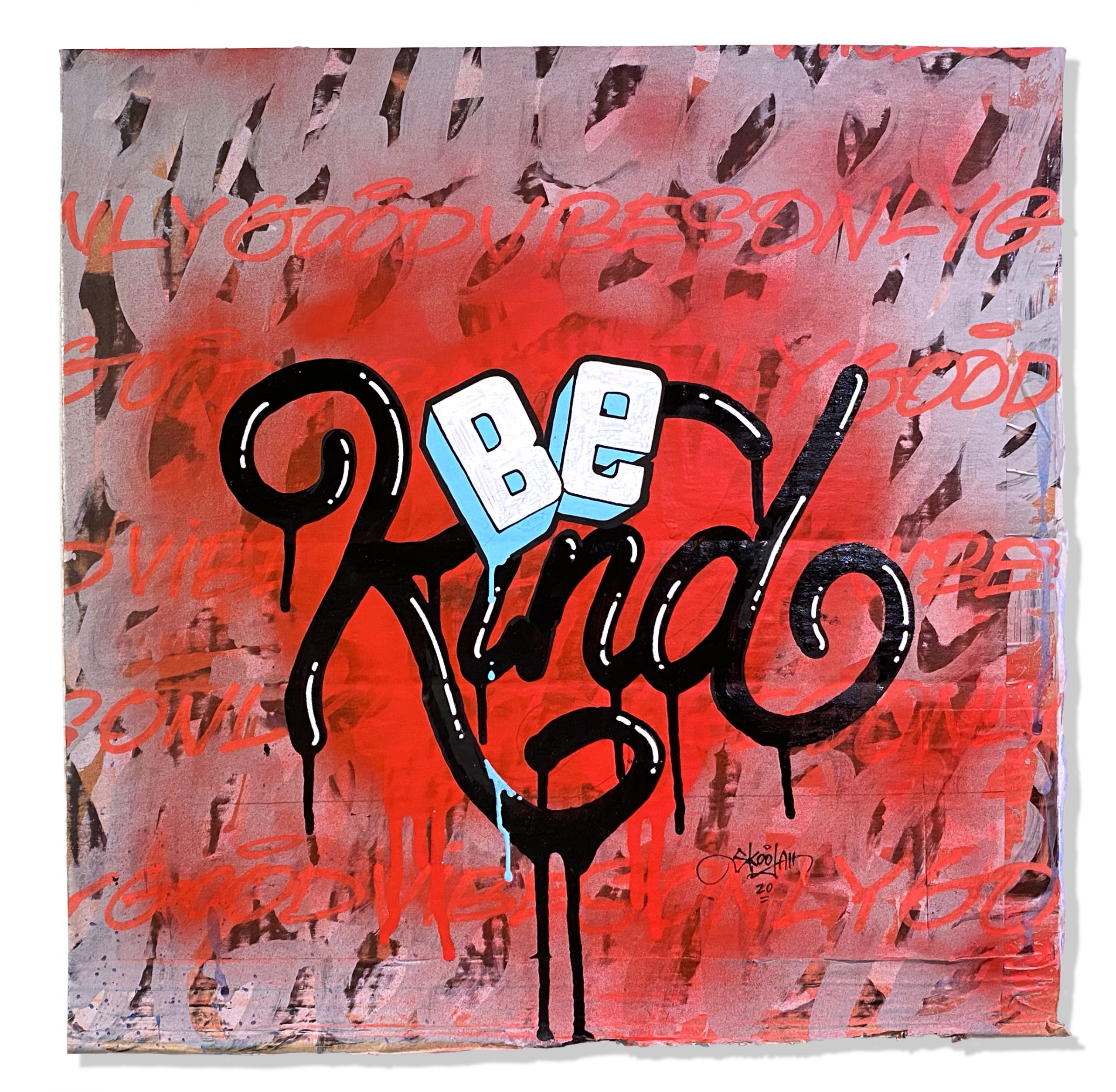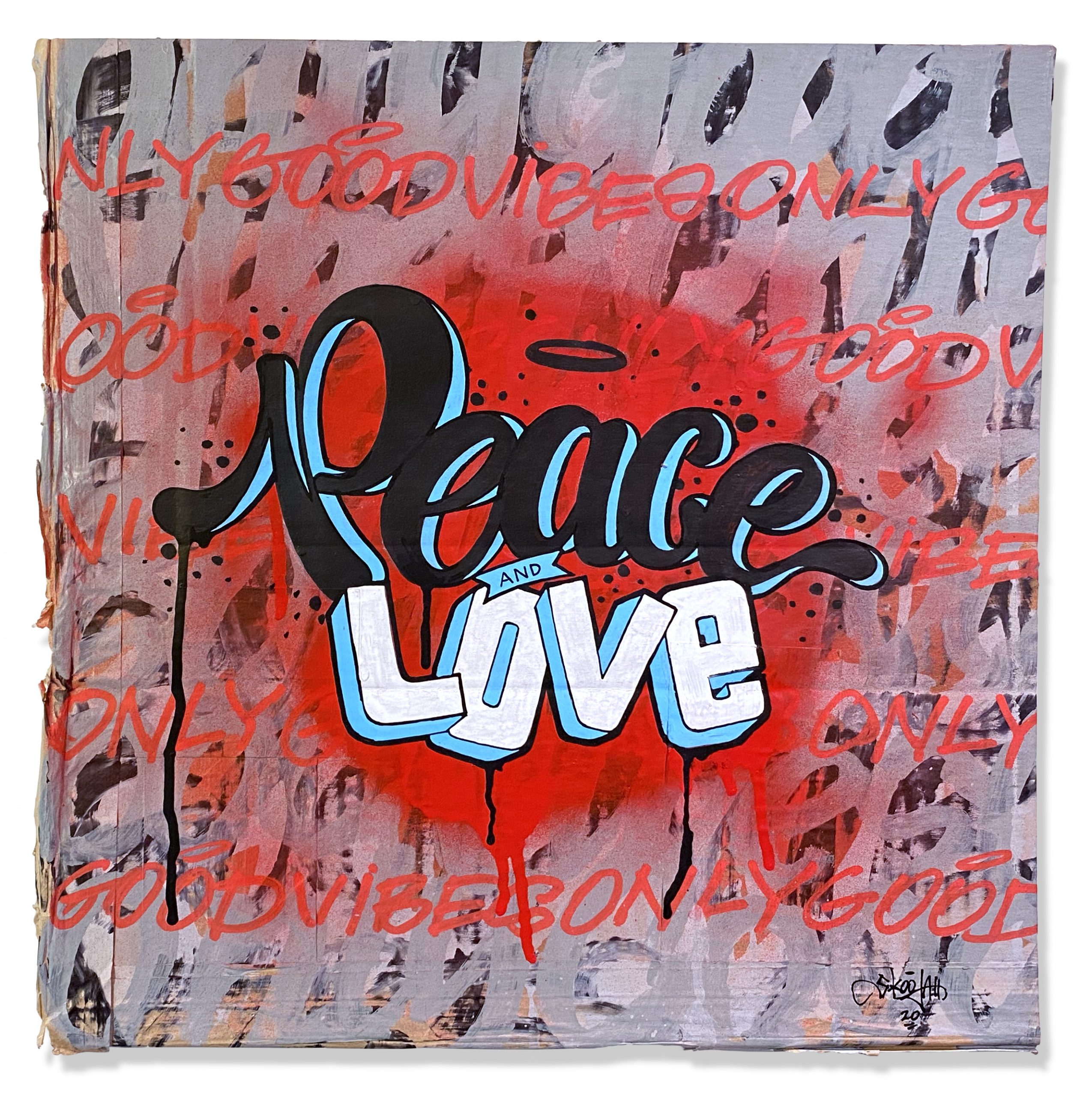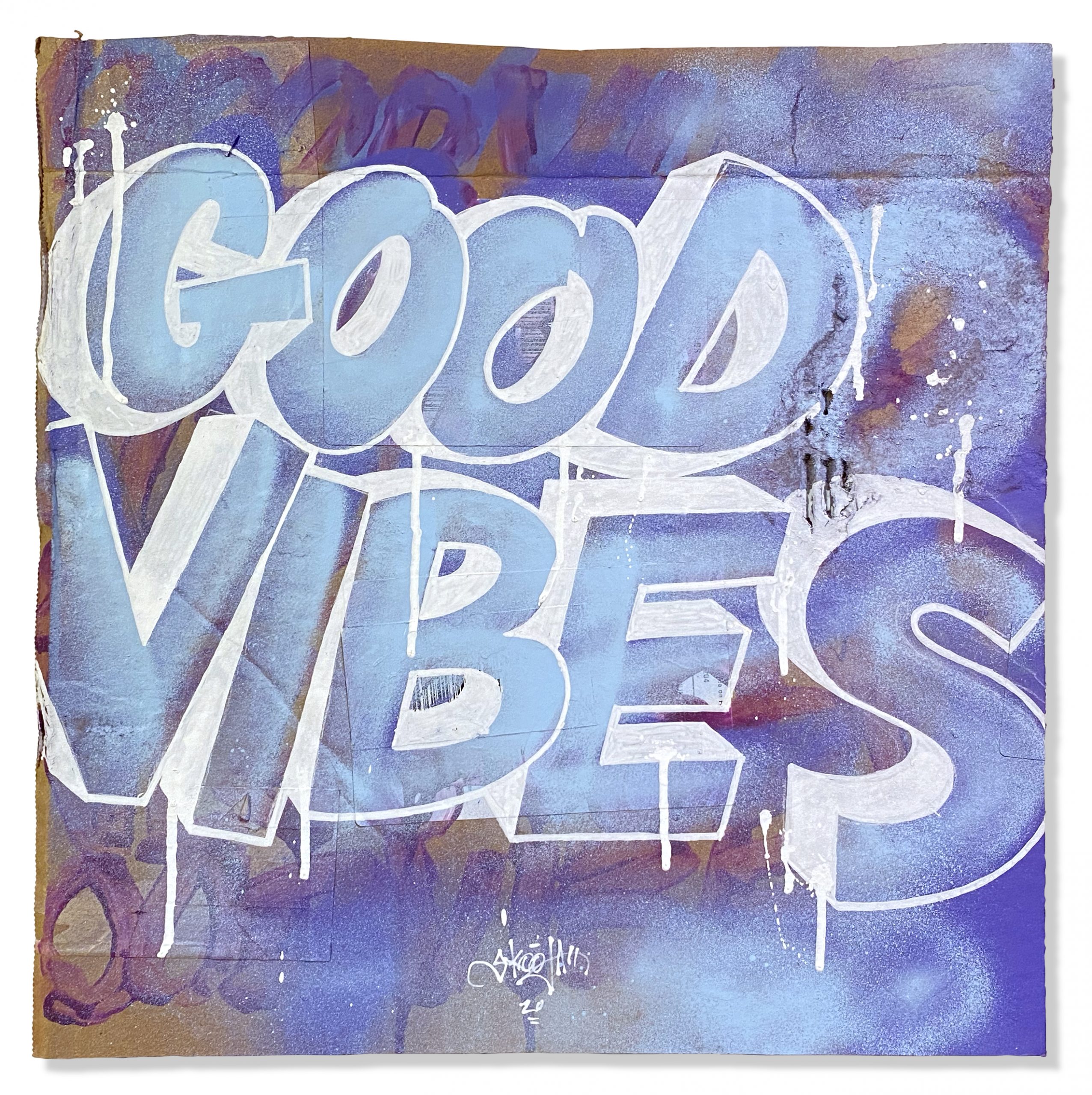 In another effort to up-cycle the Christmas cardboard waste. I did this series of positive statements to remind people to only show good vibes. The world would be a better place if we saw more things about good vibes rather than always seeing the bad. They were originally started to have a solo show in Toronto, then the Covid-19 pandemic hit and the show was canceled. So in my way of staying positive throughout the Covid-19 pandemic I was busy creating these. They were all hand painted using spray paint, paint markers and paint.